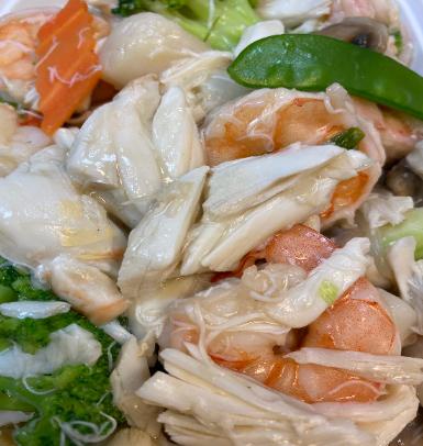 Fresh crabmeat. Jumbo shrimp, Fresh scallops sauteed with vegetables.